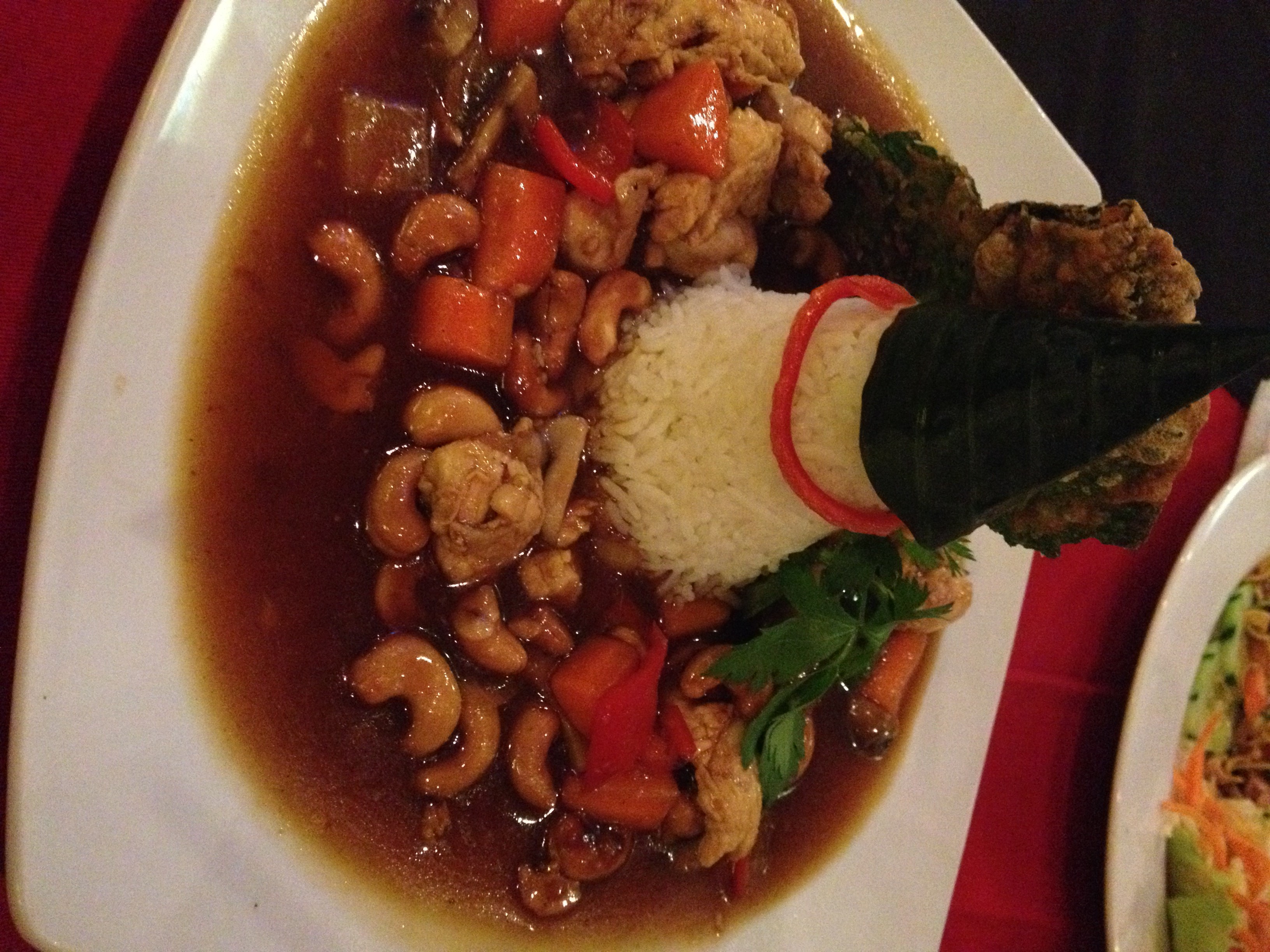 Mango juice and plain lassi with Nasi Goreng (fried rice, back) and Chicken Satay with peanut sauce and rice and vegs (front)