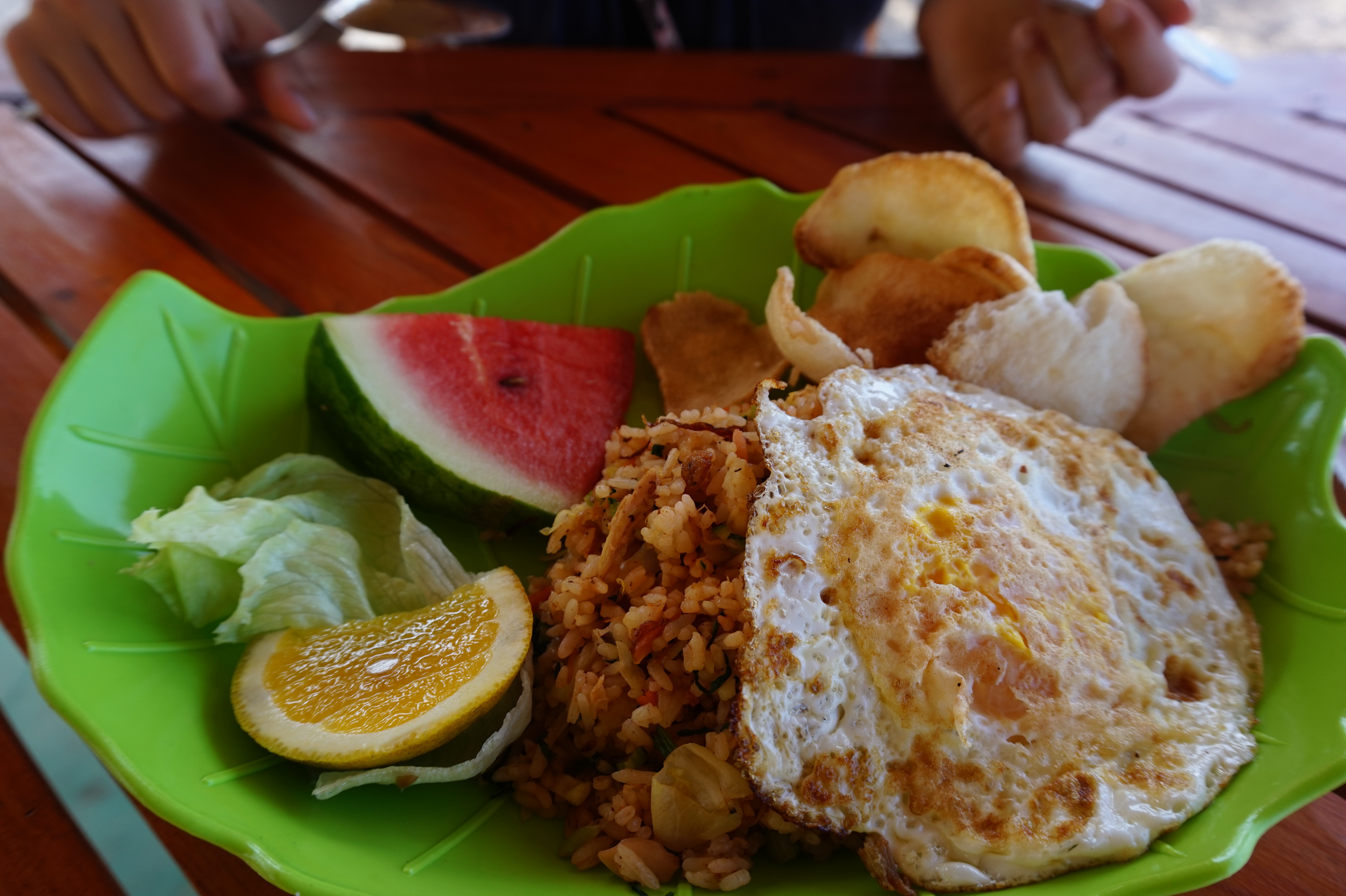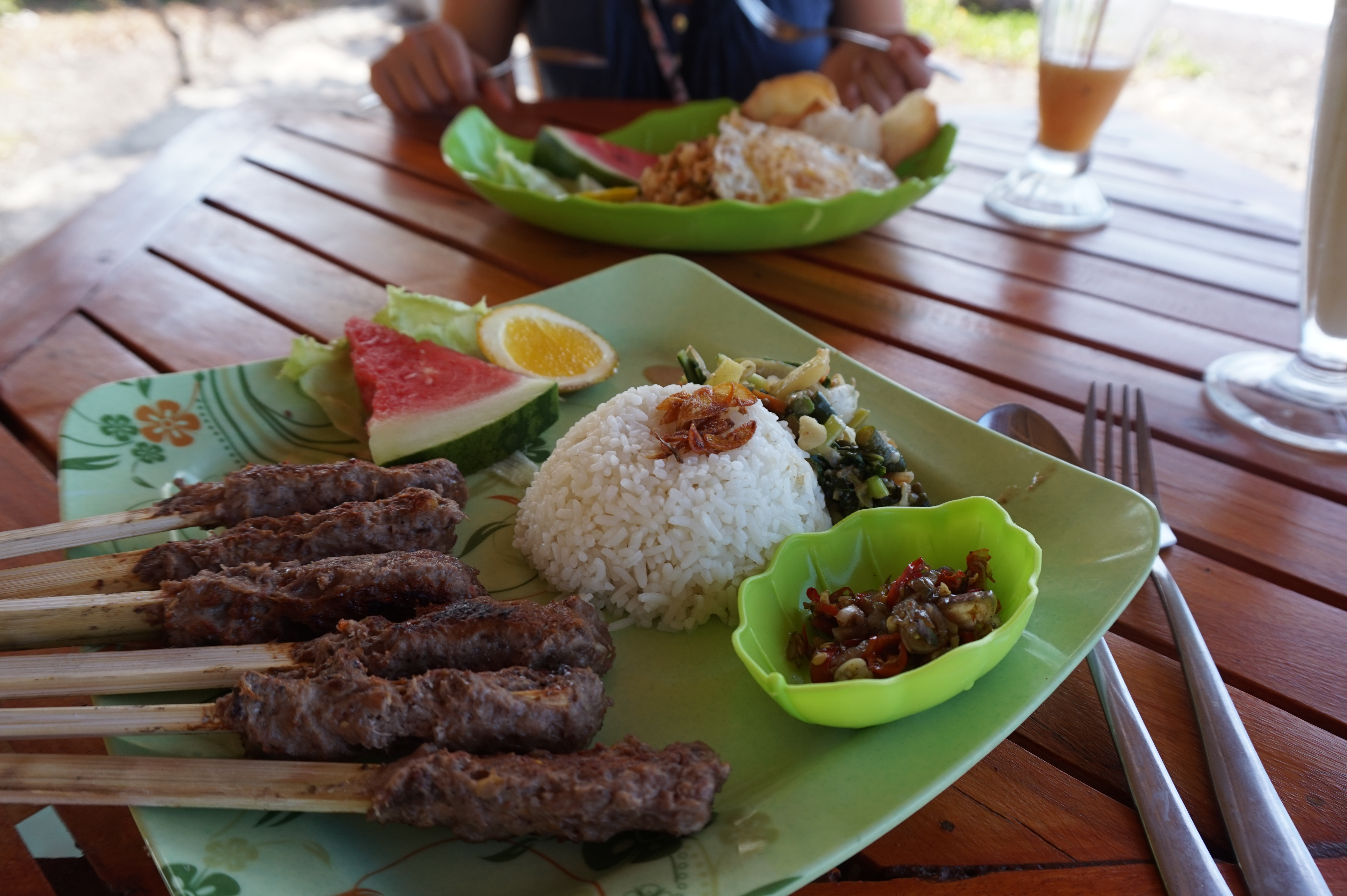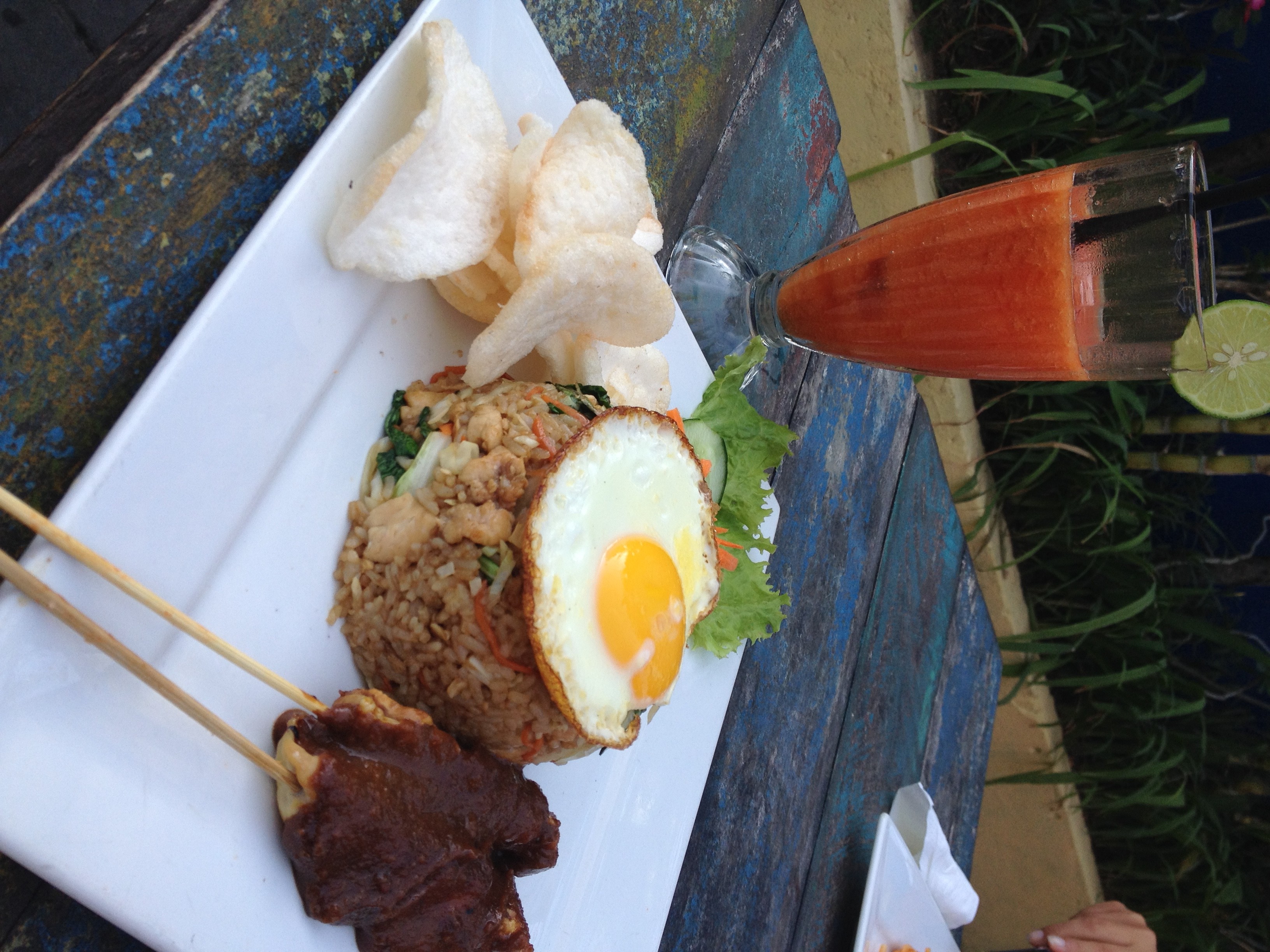 Papaya and local fruit juice, again Nasi Goreng with egg and fish satay with rice and chili