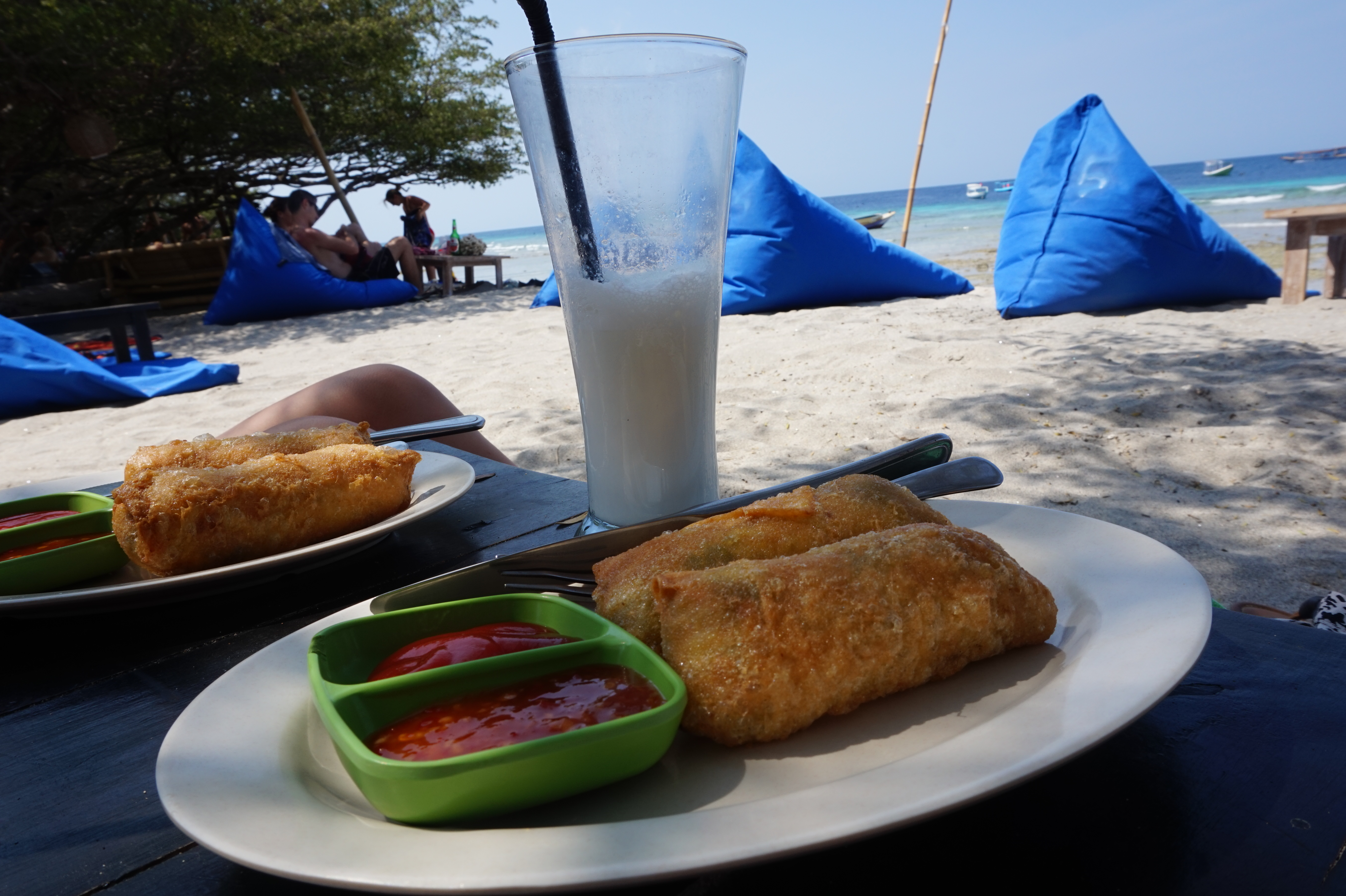 Coconut smoothie and spring rolls